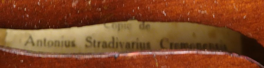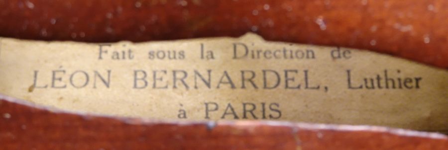 -"Fait sous la Direction de LEON BERNARDEL, luthier à Paris"; en - "Copie de Antonius Stradivarius Cremonensis Faciebat Anno 1714".
