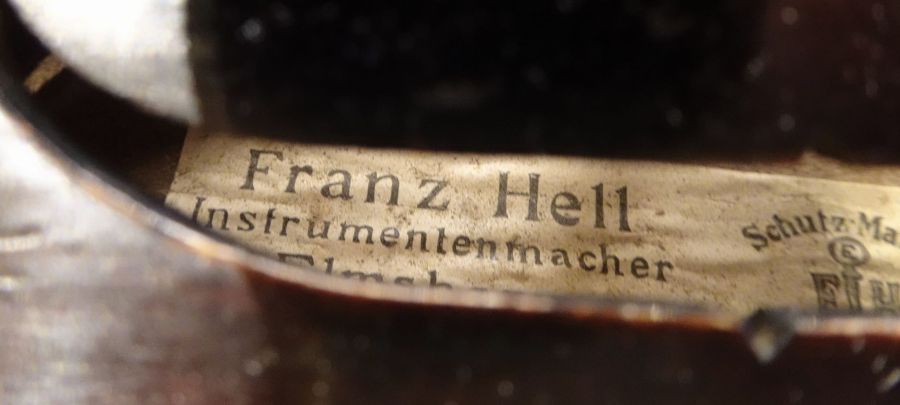 Mooi en goed klinkend instrument, perfecte bespeelbaarheid, goed volume en klankprojectie. In perfecte staat. Draagt het label van Franz Hell - Instrumentenmacher - Elmshorn - Schutzmarke FH. Op de talon staat zijn brandmerk FH. Franz Hell is geboren te Elmshorn op 26 mei 1896. Hij heeft zijn leerperiode gedaan bij E. Reinhold Schmidt en werd zijn hulp. Hell vertrok in 1921 naar Amerika maar kwam snel naar zijn geboorteland terug.