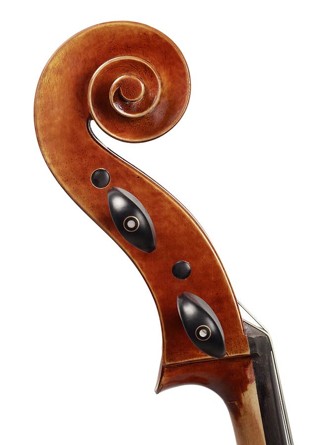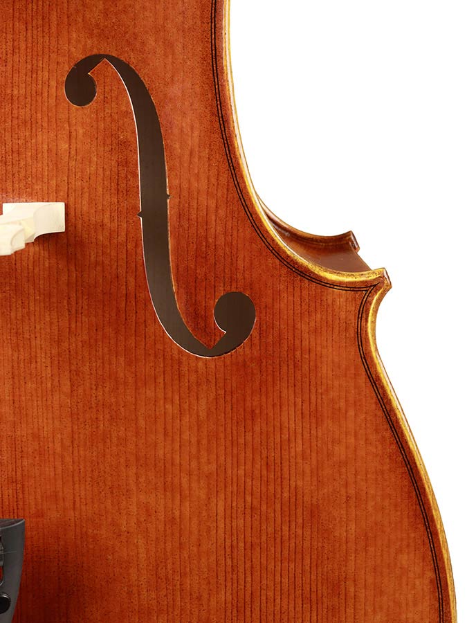 Beautiful and exceptionally good-sounding Rudolph Conservatoire cello. The craftsmanship, combined with the hand-applied oil varnish, gives this cello a lovely antique look: amber, dark brown on a golden yellow base. The cello is made of European tonewoods: spruce top, maple back, ribs, and neck with scroll. Ebony fingerboard and pegs. It is a powerful, well-balanced cello, ideal for ambitious students and serious players. The denser European tonewoods provide a slightly brighter, more direct, and more powerful tone without losing the rich, warm tone characteristic of these conservatory cellos. The cello has a tailpiece with four built-in fine tuners made of lightweight synthetic materials. The pin is made of solid carbon to keep the instrument as light as possible. It is finished with an antique-style brown oil varnish.